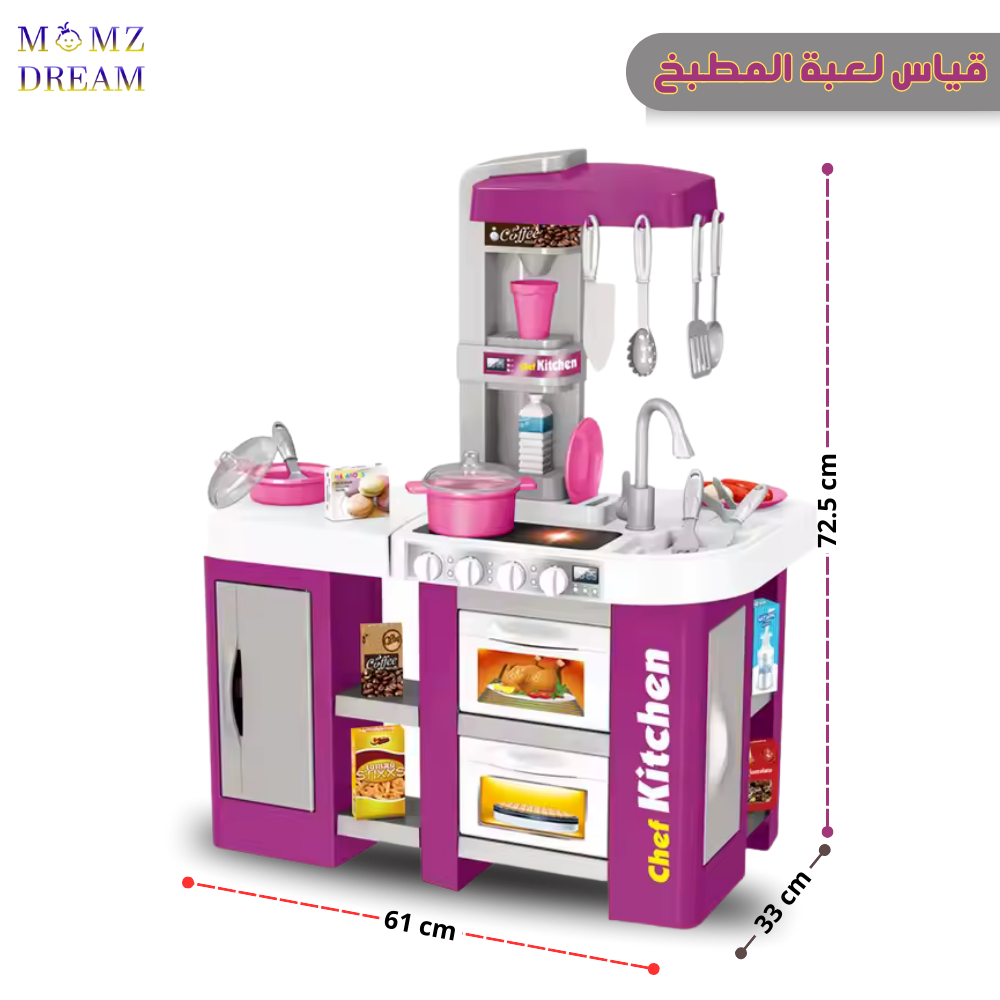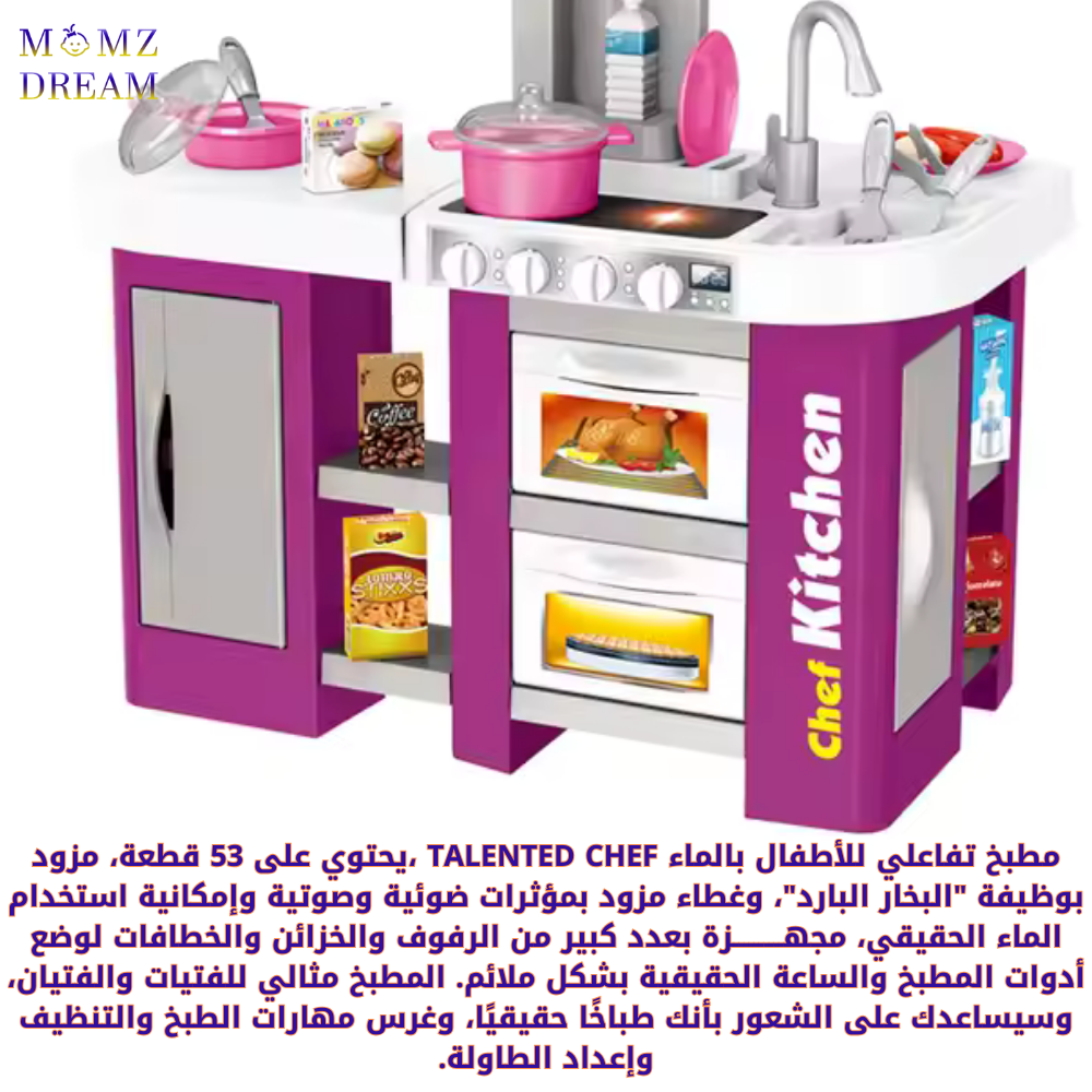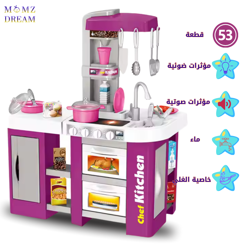 مجموعة ألعاب مطبخ للأطفال مزودة بمؤثرات صوتية وضوئية واقعية وتتضمن حوض وموقد طهي بالبخار ووعاء ومقلاة وغسالة صحون ، ويحتوي على 53 قطعة .