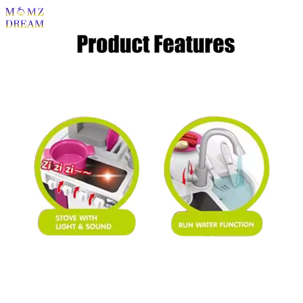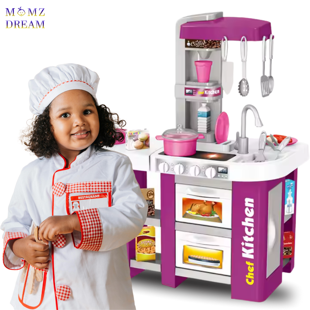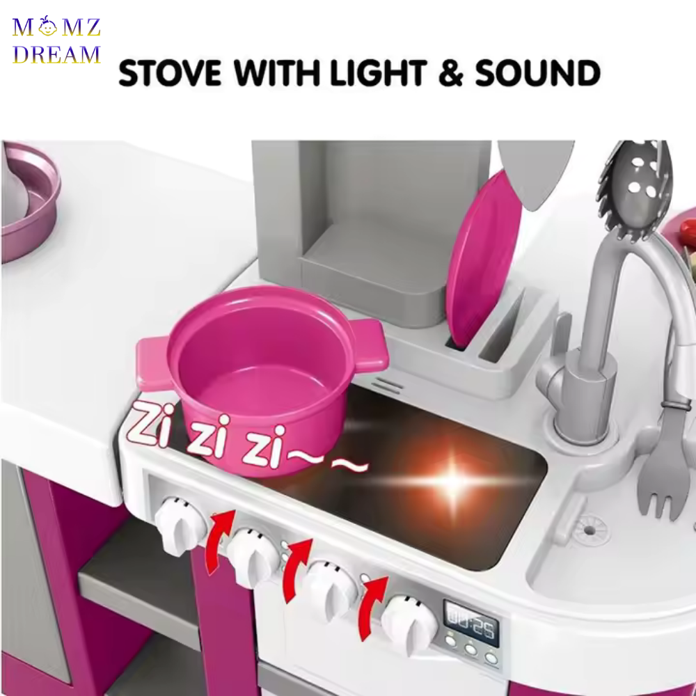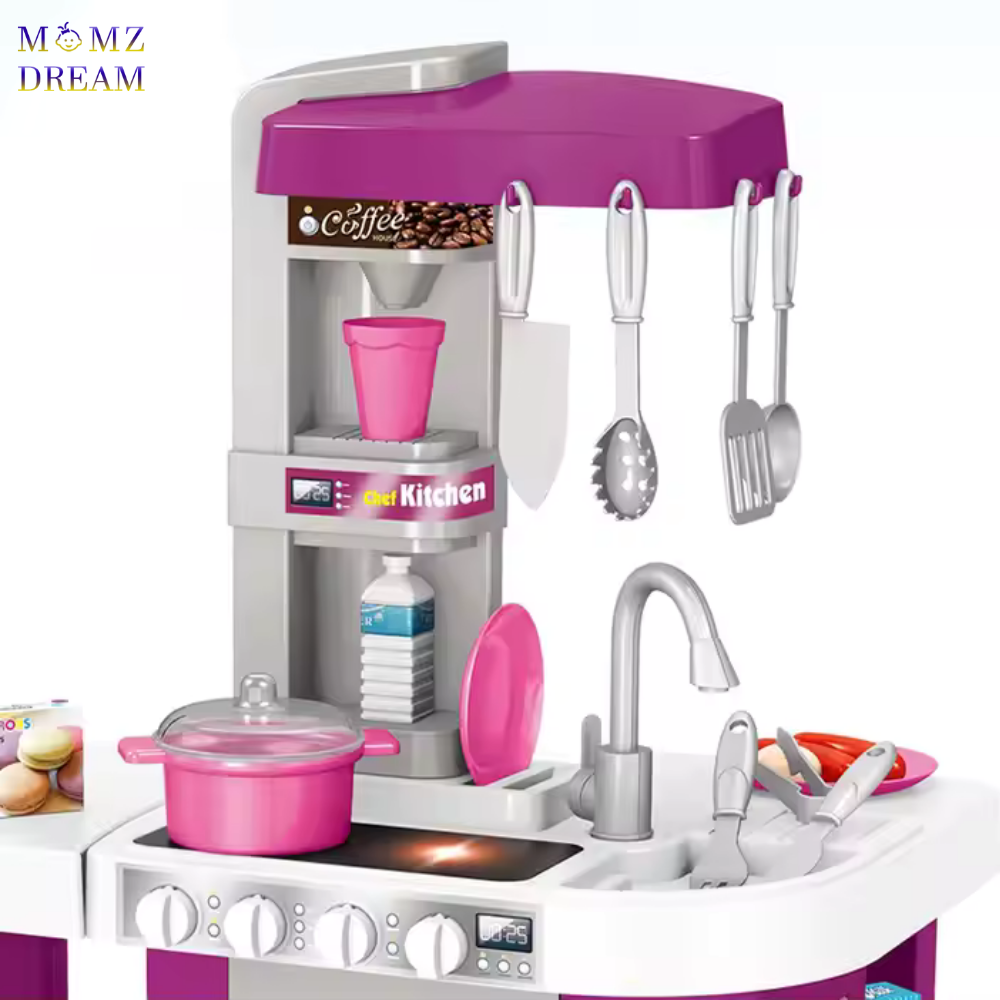 مجموعة ألعاب مطبخ للأطفال مزودة بمؤثرات صوتية وضوئية واقعية وتتضمن حوض وموقد طهي بالبخار ووعاء ومقلاة وغسالة صحون ، ويحتوي على 53 قطعة .
