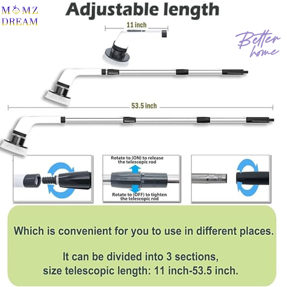 3- فرشاة تنظيف كهربائية بمقبض قابل للتعديل: يتميز مقبض الفرشاة الكهربائية بهيكل قابل للسحب وقابل للإزالة، والذي يمكن تمديده من 40 سم الى 109 سم الى 132 سم ، للتكيف مع المستخدمين بأحجام مختلفة، ويمكنه تنظيف كل ركن من أركان المنزل بسهولة دون انحناء، مناسب بشكل خاص لكبار السن أو الأشخاص الذين يعانون من عدم راحة المفاصل. يمكن استخدام فرشاة التنظيف اللاسلكية في أي وقت وفي أي مكان، وهي هدية رائعة لأمك وعائلتك.
