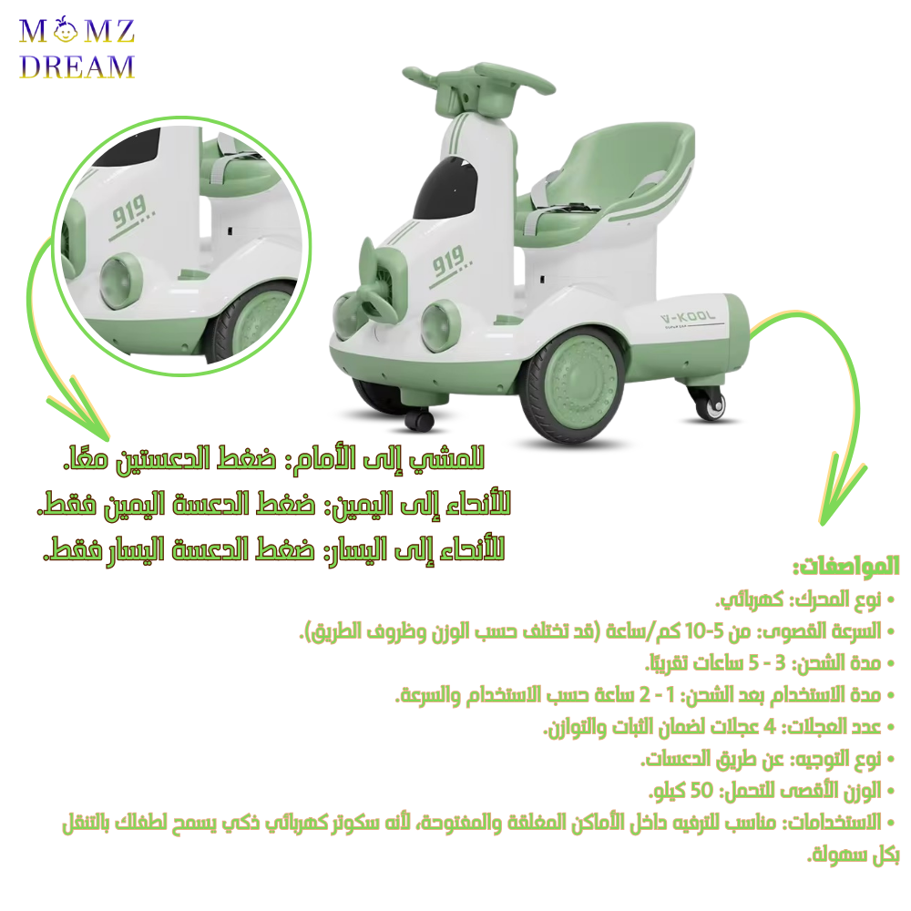 امنح أطفالك تجربة ترفيهية ممتعة وآمنة مع سكوتر كهربائي ذكي يجمع بين التصميم العصري والتقنيات الحديثة، ليكون الرفيق المثالي في الحدائق والمجمعات والأماكن الترفيهية.