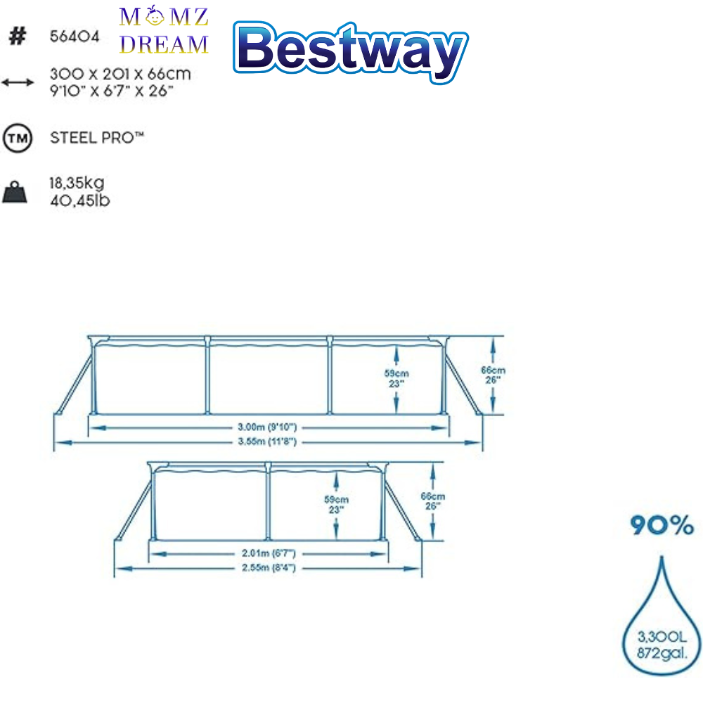 - يأتي المسبح بسعة 3300 لتر ما يعادل ( 872 جالون ).