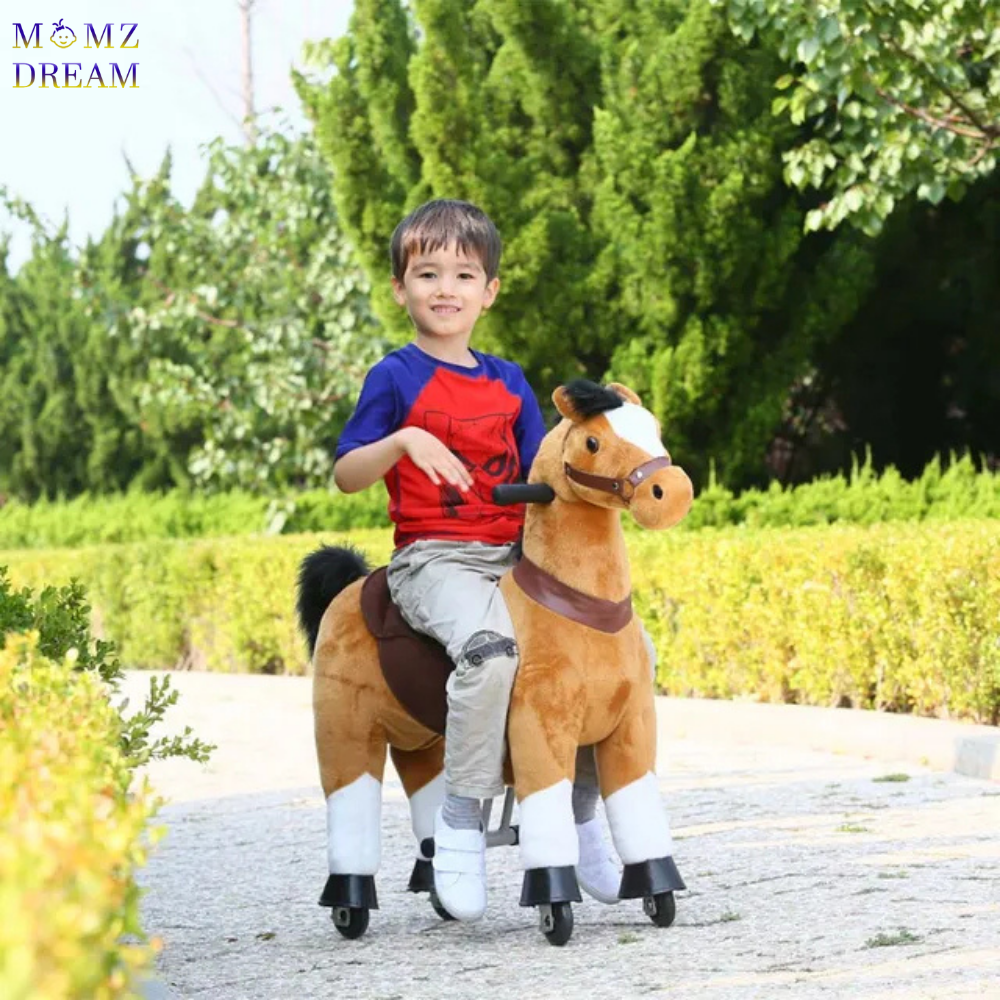 حصان للركوب لعبة ركوب بدون بطارية كهرباء ميكانيكي بني مهر قابل للمشي لعمر 3 الى 8 سنوات.