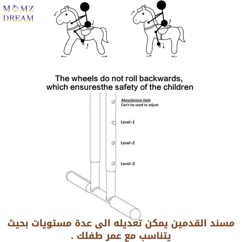 4- نظام السلامة لعبة حصان بدون بطارية، بدون كهرباء. لا تتدحرج العجلات للخلف، مما يضمن سلامة الأطفال. سهل التركيب والصيانة. تتوافق سلامتنا مع الجمعية الأمريكية لاختبار المواد F963 وتتوافق مع لوائح لجنة سلامة المنتجات الاستهلاكية الأمريكية بشأن ألعاب الركوب للأطفال.